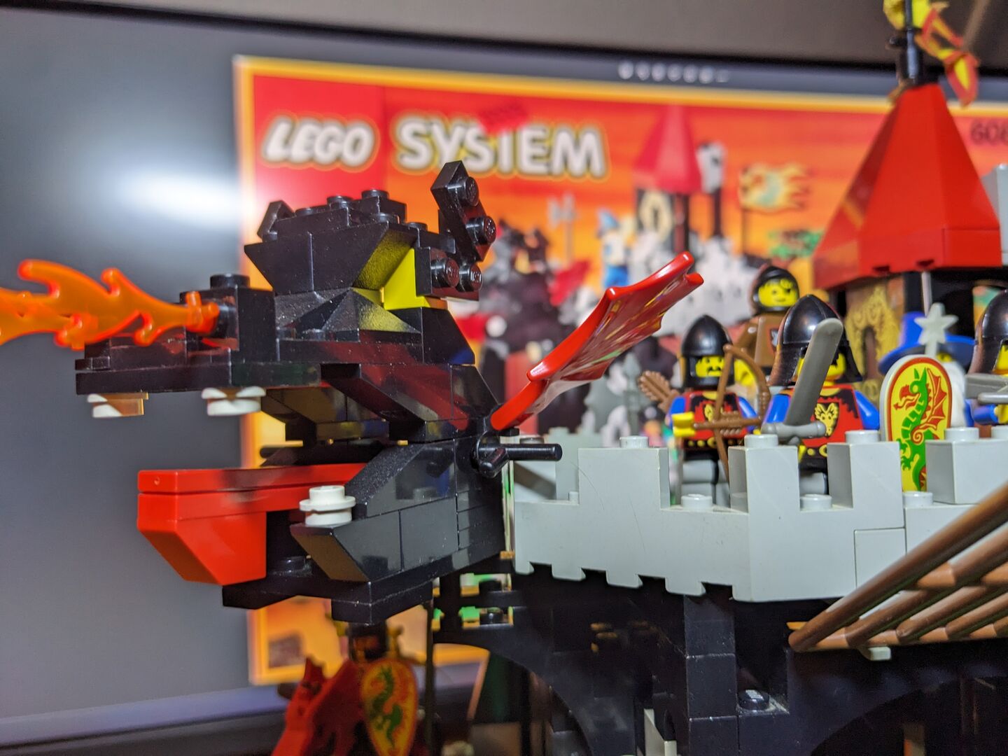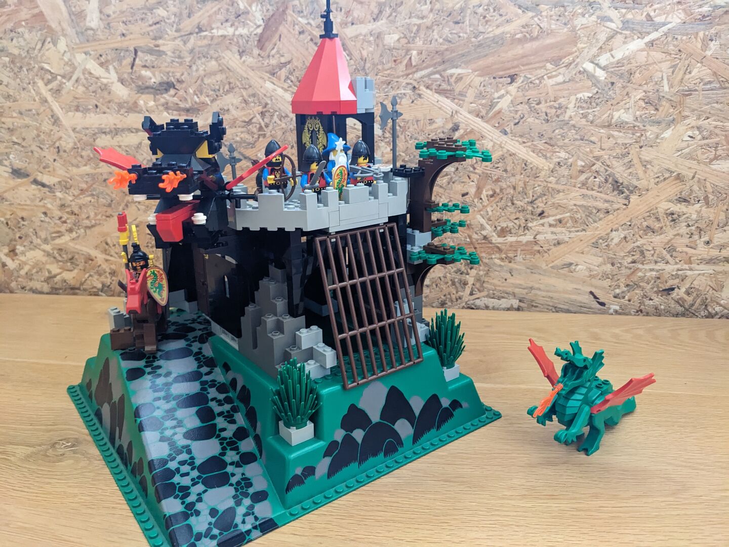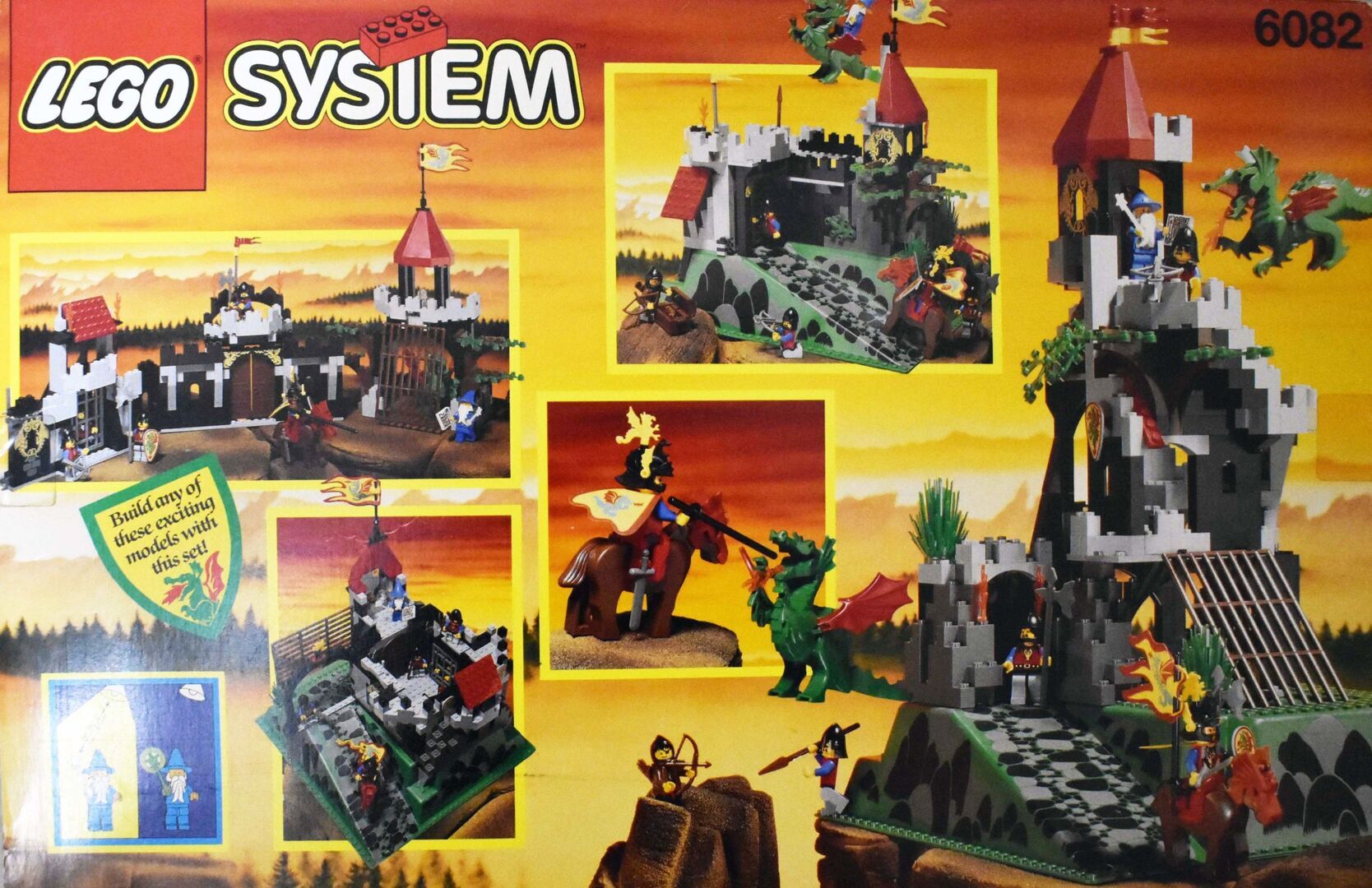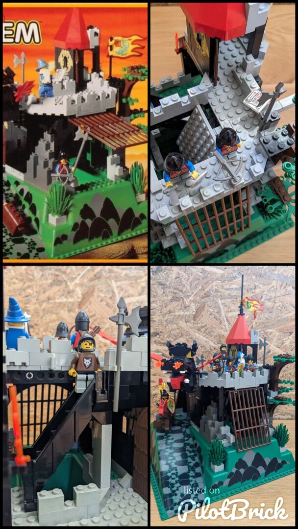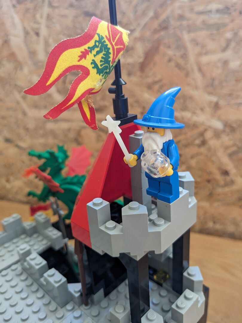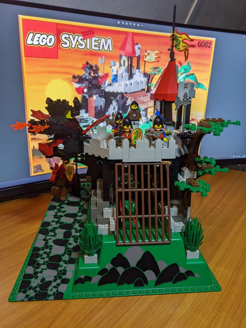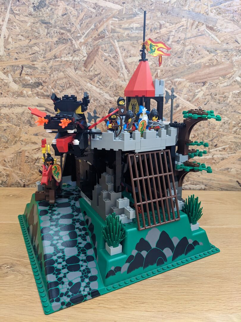 Complete with minifigs and instructions in good condition, though the material flag is torn. Review:  "Has got better with age  An enjoyable build - much better than many of today's sets. And what's more, with my five-year-old, I couldn't believe just how much play value there is in this design. It feels a bit more robust and seems to have more features than some of the earlier, mid-sized designs. For example, the secret entrance, the prison, the trap door, Merlin's tower, and the cave for the dragon with a secret potion inside the treasure chest - not to mention a brilliant set of minifigs. You can play "Rescue the Wolf Man", or free Merlin, or protect Merlin etc etc so many options! So, I think this set has aged very well, and looks classic but not dated with nice bright colours. My solution too - keep all of the Dragon Knights set separate from the 1992 and before sets. Pit them against the royal knights, with only the odd wolf man crossing over into 92, and that's your answer!"  Written by Adrock (AFOL) in the United Kingdom, 07 Feb 2022 https://brickset.com/sets/6082-1/Fire-Breathing-Fortress
