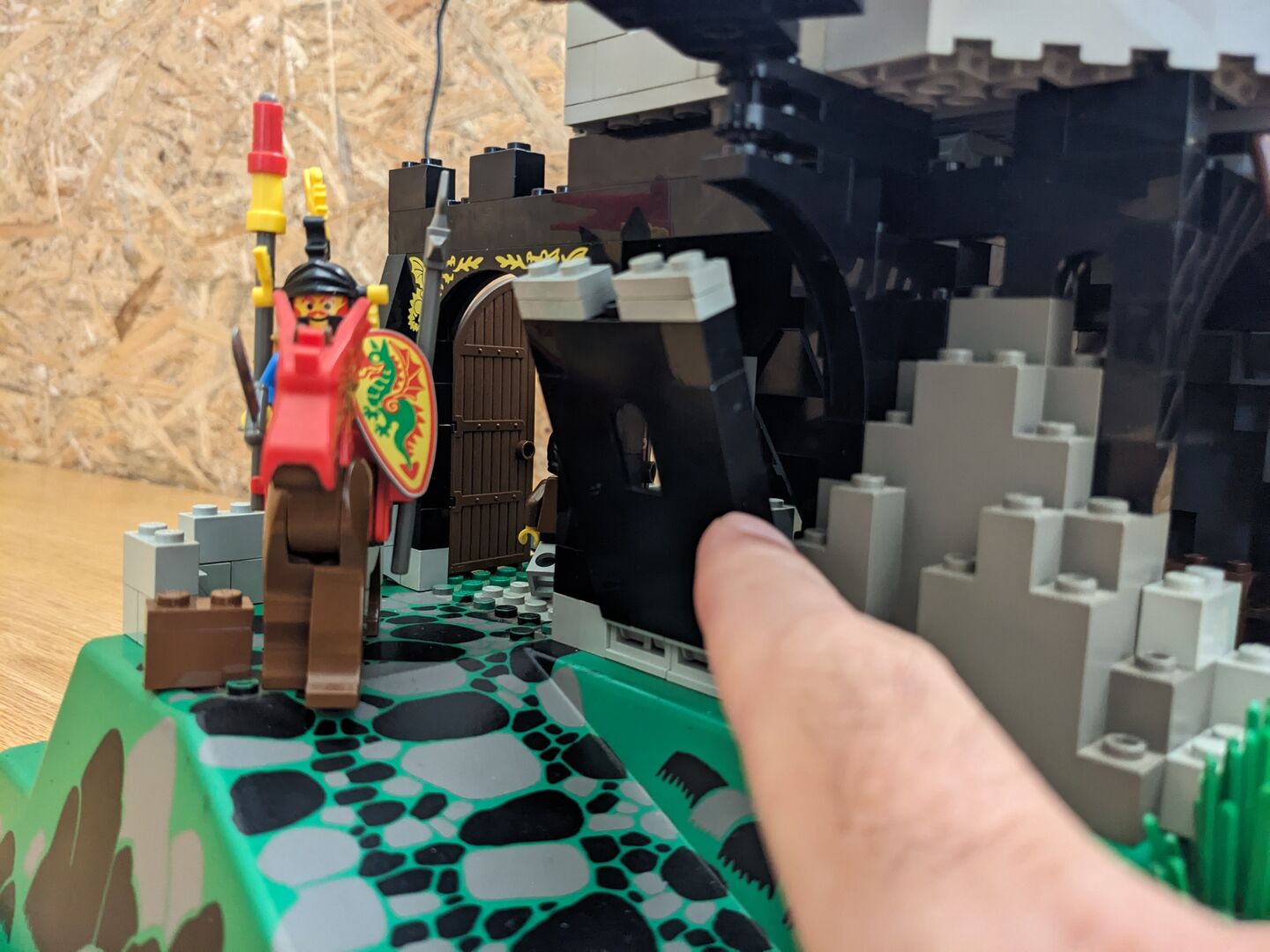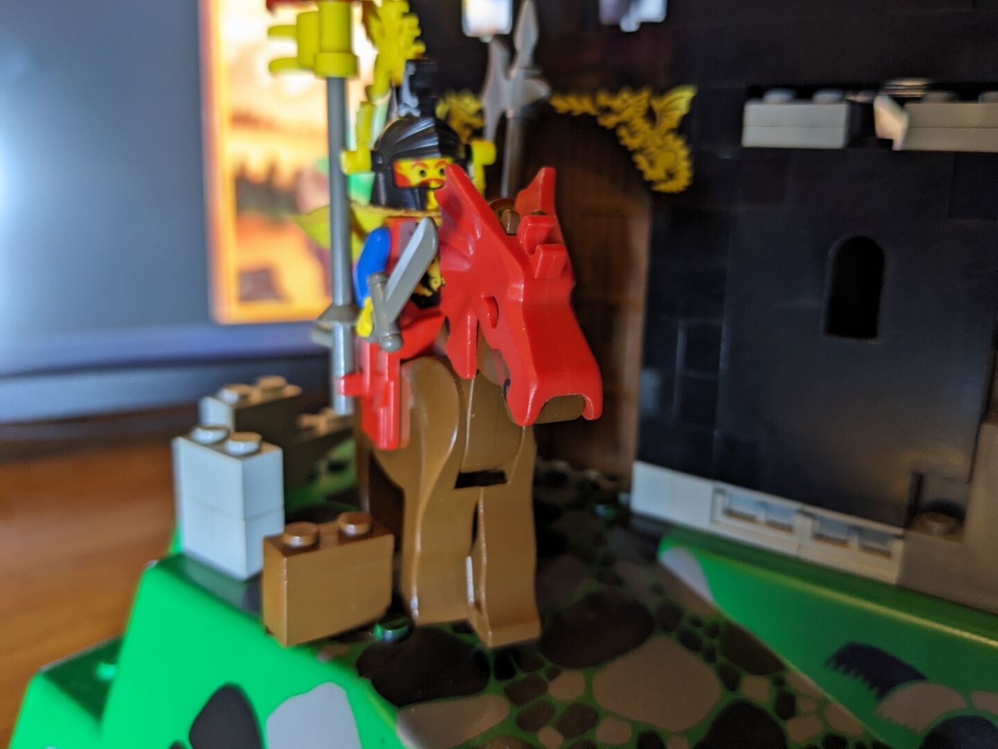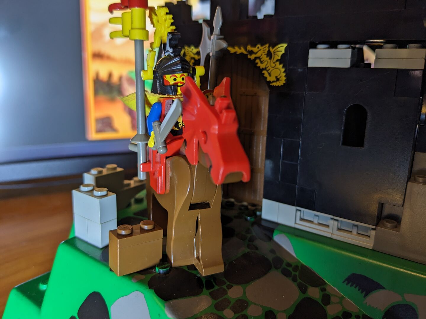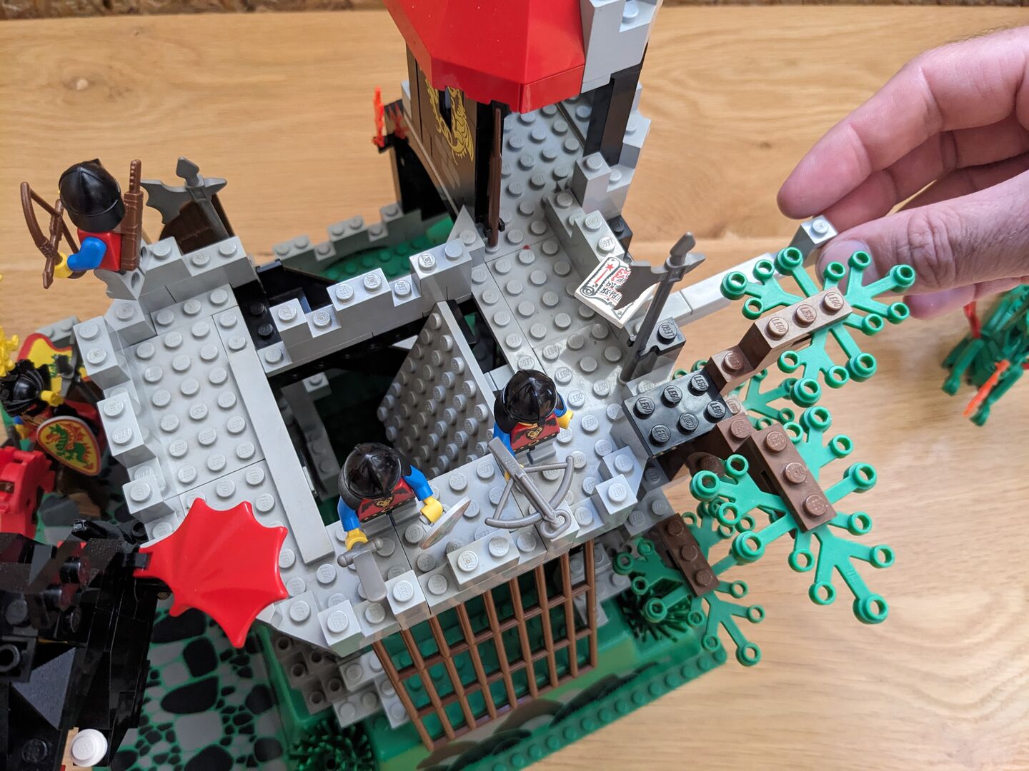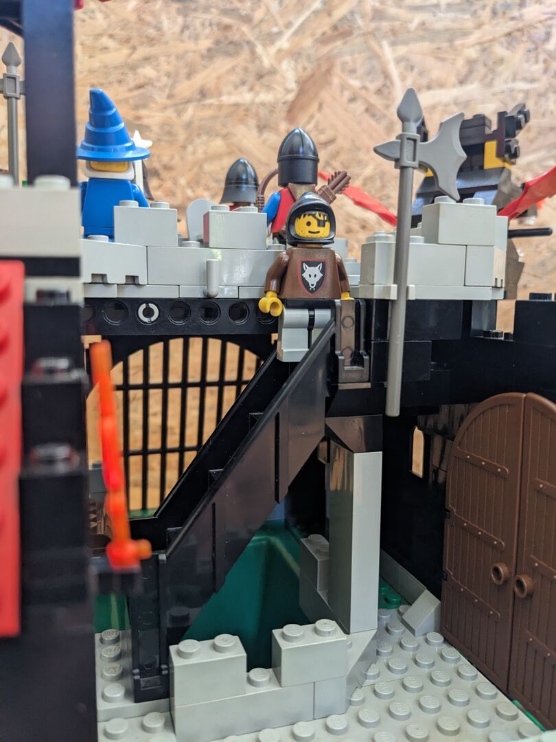 Complete with minifigs and instructions in good condition, though the material flag is torn. Review:  "Has got better with age  An enjoyable build - much better than many of today's sets. And what's more, with my five-year-old, I couldn't believe just how much play value there is in this design. It feels a bit more robust and seems to have more features than some of the earlier, mid-sized designs. For example, the secret entrance, the prison, the trap door, Merlin's tower, and the cave for the dragon with a secret potion inside the treasure chest - not to mention a brilliant set of minifigs. You can play "Rescue the Wolf Man", or free Merlin, or protect Merlin etc etc so many options! So, I think this set has aged very well, and looks classic but not dated with nice bright colours. My solution too - keep all of the Dragon Knights set separate from the 1992 and before sets. Pit them against the royal knights, with only the odd wolf man crossing over into 92, and that's your answer!"  Written by Adrock (AFOL) in the United Kingdom, 07 Feb 2022 https://brickset.com/sets/6082-1/Fire-Breathing-Fortress