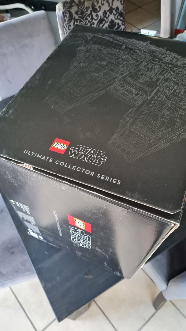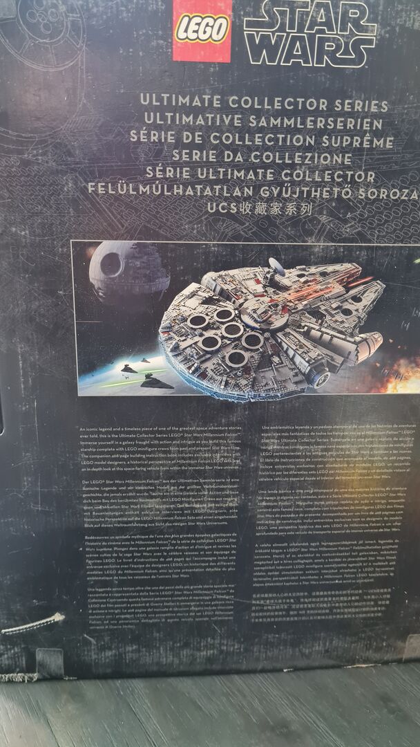 Complete UCS Millennium Falcon. All pieces re-bagged in ziplock bags according to original bag numbers. Only built once and displayed for a very short time (few weeks) then disassembled. Extra pieces all included as are all minifigs All interior boxes are present and bags inside according to instructions. Instructions also in very good condition. Outer box shows minor scuffing on bottom but is also in very good condition. Also included is a custom built version of Efferman's Vertical stand. All parts original and sourced from Bricklink. Stand was never used. Also included is a battery pack and LED strip light to customise the tail thruster engine of the Falcon so it can light up. Lighting was never used. Stand and lighting alone cost me around R1500. Get all of the above now at a bargain price! Price is slightly negotiable.