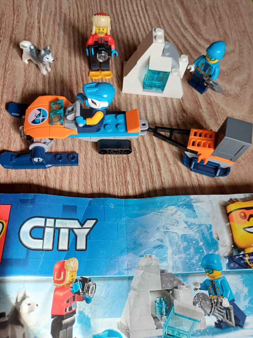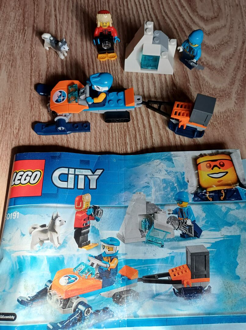 LEGO City Artic Exploration Team (60191) - 100% complete, comes with minifigures and instruction manual. The set features a snowmobile with trailer hitch, trailer and storage box, plus an ice block element holding an insect encased in ice, saw, camera and a pair of snowshoes. Includes 3 LEGO minifigures and a LEGO husky dog figure