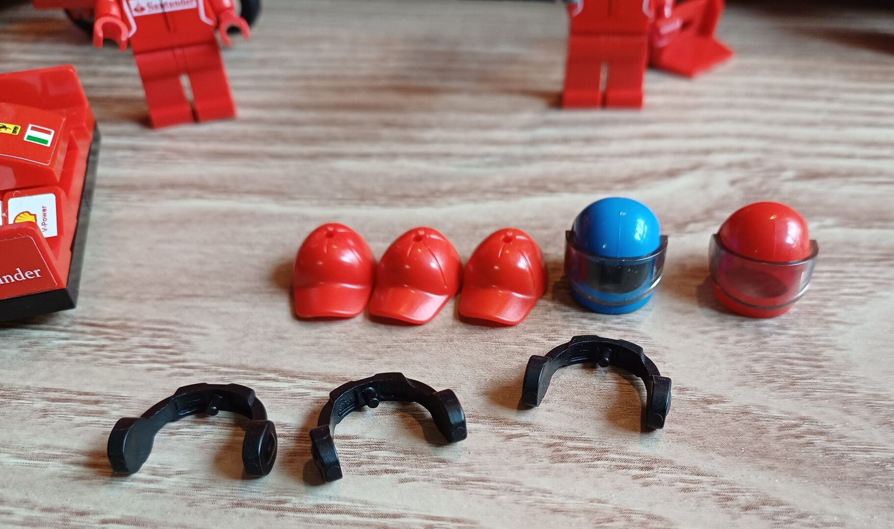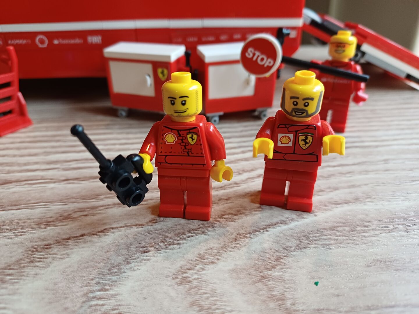 F14 T & Scuderia Ferrari Truck 100% pieces and stickers with the following substituted ;see pictures: 1. Silver helmet replaced by red helmet 2. 3 torsos not original set torso, replaced by ferrari/shell 3. 1 x black beard head replaced by dark Grey beard 4. 1 x scooter wheel light Grey not white 5. Ferrari back wing stickers not original stickers 6. Two 1x8 red plates replaced by 1x6 and 1x10 plate 7. 2 torsos have yellow hands not red