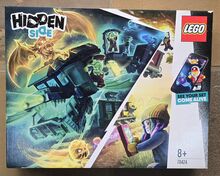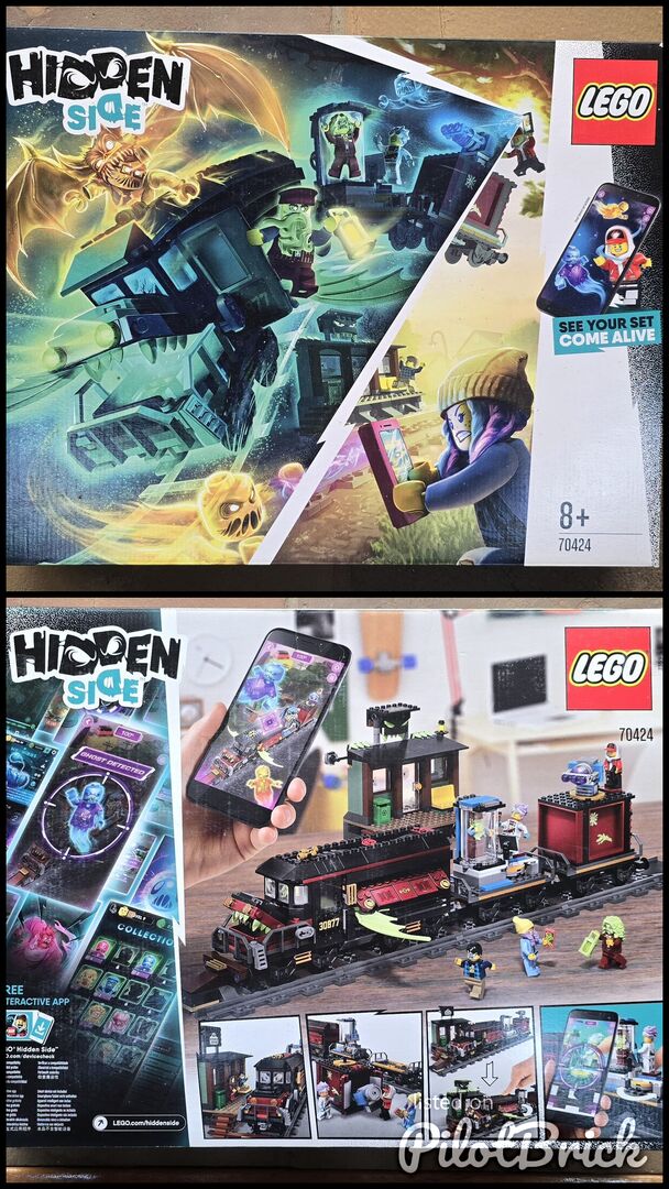 Slight damage on box. Never opened. LEGO Hidden Side Ghost Train Express (70424). It is a 698-piece building set aimed at ages 8+ that was released in 2019. The set features a ghostly train and includes 6 minifigures. It integrates with a free LEGO Augmented Reality (AR) app to allow kids to hunt ghosts and solve mysteries digitally.