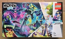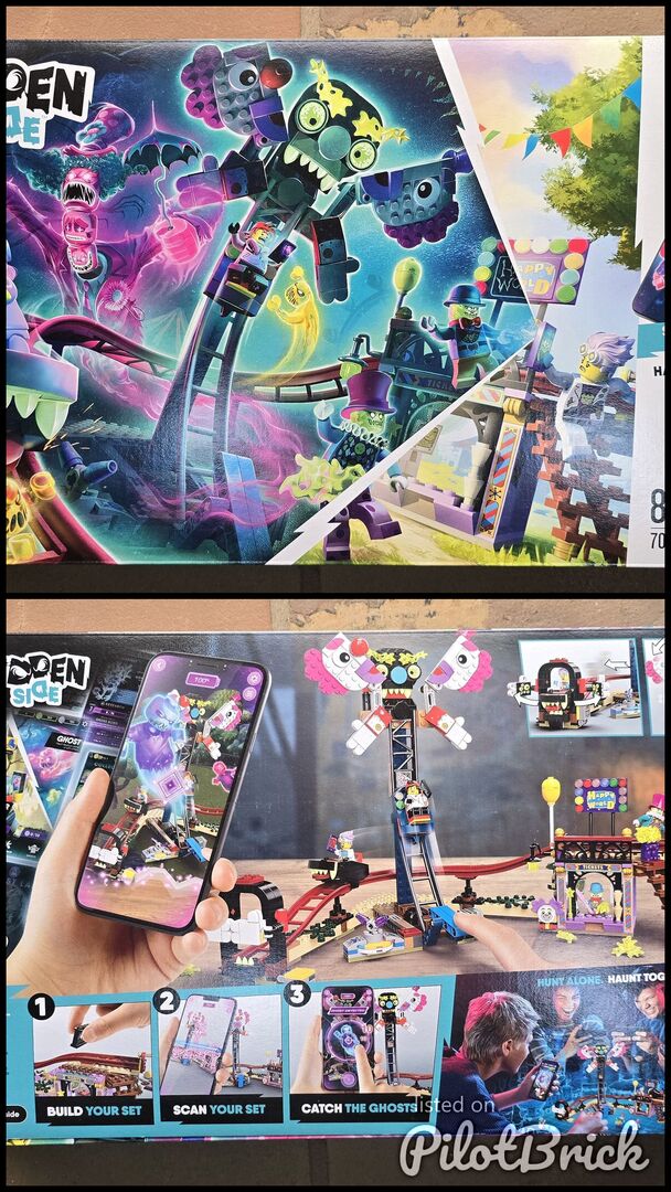 LEGO Hidden Side Haunted Fairground (set 70432). It is a 466-piece building kit featuring a haunted roller coaster and drop ride. The set includes 5 minifigures: Jack Parker, J.B., Jimbo, Loblo, and Terry Top. It offers an augmented reality (AR) experience, allowing the physical model to come alive when viewed through a smart device equipped with the LEGO Hidden Side app. The set is designed for children aged 8 and up.