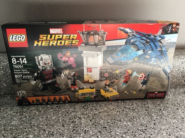 Stage an epic battle at the airport, featuring an air traffic control tower with 2 different explode functions and a luggage cart with an explode-function rear trailer. Fold out the wings of the dual cockpit Quinjet to take off and open the rear hatch to drop the rope for Captain America to grab. Then turn the switch to unleash the jet's hidden stud shooters. Includes 6 minifigures: Captain America, Winter Soldier, Scarlet Witch, Iron Man, War Machine and Agent 13, plus an Ant-Man microfigure and a buildable Giant Man figure.  Build an epic hero-vs.-hero battle with a supersonic Quinjet with hidden stud-shooters and folding wings, an “exploding” air traffic control tower, the gigantic Giant-Man, and more! The ultimate action scene from Captain America: Civil War Includes minifigures of Captain America, Winter Soldier, Scarlet Witch, Iron Man, War Machine, and Agent 13, plus an Ant-Man microfigure and a buildable Giant-Man figure LEGO Marvel Super Heroes building toys are compatible with all LEGO construction sets for creative building Air traffic control tower is over 10” high, 9” wide, and 3” deep. Quinjet is over 3” high, 7” long, 12” wide in flight mode, and 7” wide in landing mode 807 pieces – For boys and girls between the ages of 8 and 14 years old