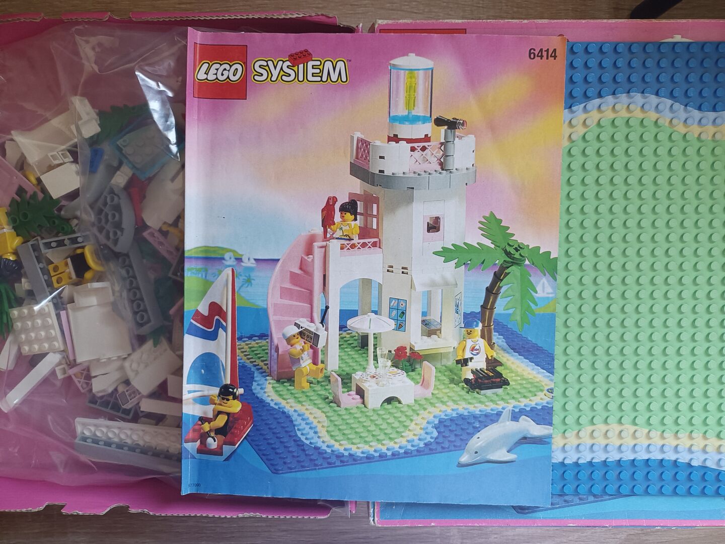 Paradisa Dolphin Point (6414) is a great 1990s Lego set, purchased in 1997, that is in good condition. The set has all mini figures, the original box, the instructions, and all original pieces needed to build the set except for two pieces that have been replaced as follows: 1. Light gray plate 1 x 2 has been replaced with 2 pieces: 2 X Gray plate, round 1 x 1. The original piece is part of the speedboat. Once it is fully constructed, the piece is barely visible (see photos). 2. Light gray plate 1 x 4 has been replaced with 2 pieces: Pink plate 1 x 3 AND pink plate 1 x 1. This piece is also barely visible once the set is fully constructed (see photos) Stickers have already been placed. Extra pieces are not available. The asking price is substantially lower than the BrickLink price guide.