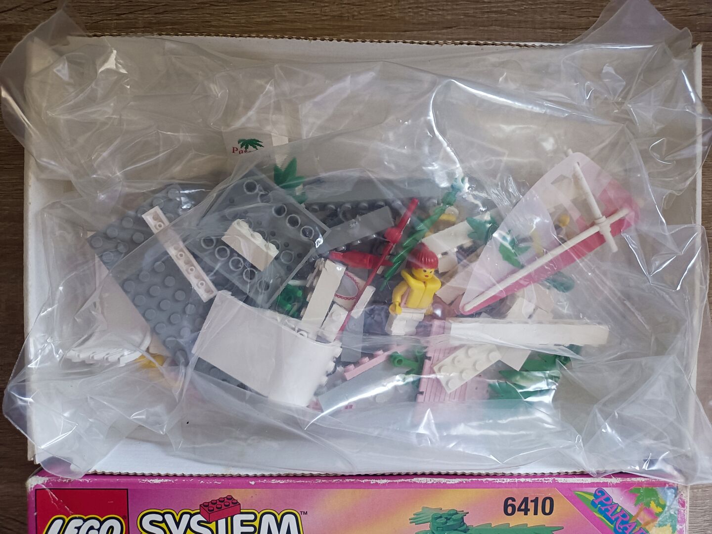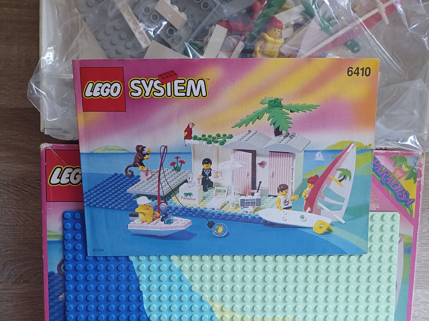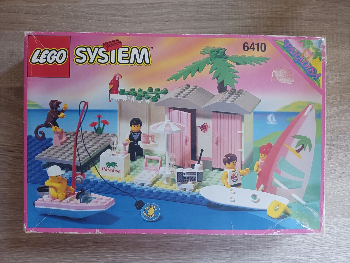 The 1990s set is in excellent condition and is a lot of fun to put together. The parrot, monkey, fishing rod, life jackets, windsurfer speed boat, and boombox really enhance the set. The set is complete with all mini figures, original box, all pieces, and instructions. A few pieces are assembled and stickers have already been placed.