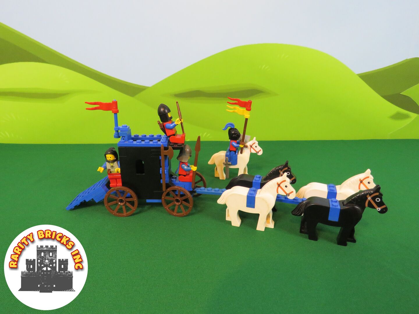 LEGO Prisoner Convoy Set Number: 6055 (Released 1985) Theme: Vintage LEGO - Classic Castle Condition: - Complete (substitute), with replacement pieces - Black saddle replaced with blue saddle - Dark grey grille helmet with red plume replaced with black helmet and blue plume - Good condition, with some wear and minimal print fading (head, torso, flags, etc.). - No discolouration Instructions: Yes