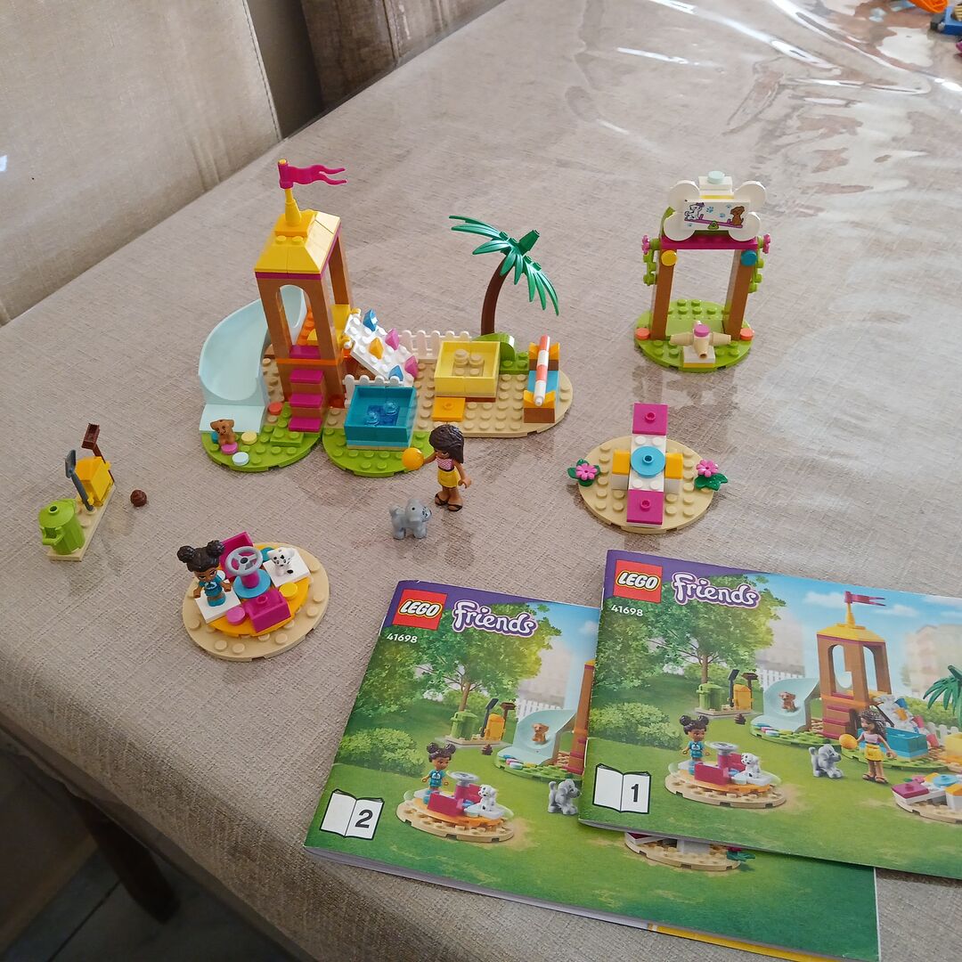 2 minifigures. 3 puppies. A slide, seesaw etc